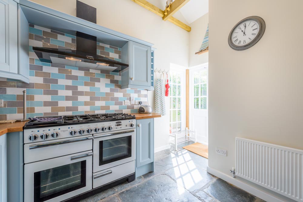 - High specification kitchen with blue shaker units, slate floor, vaulted feature ceiling and double doors to private patio with table and chairs.